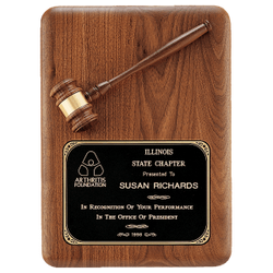 This walnut round corner plaque features a walnut gavel and a black laserable brass plate. Keyholed for verticle hanging, this plaque is a great way to recognize judicial careers as well as club or organization officers.