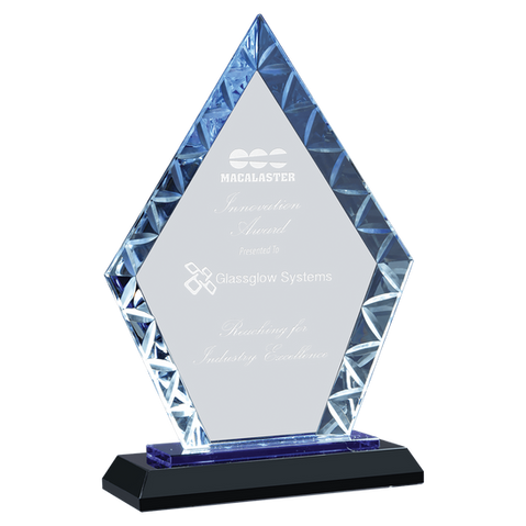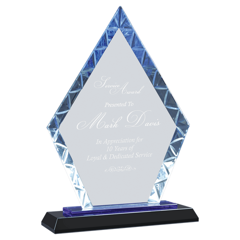 Premier Crystal is the optimal showcase for accomplishment. Premier Blue Accent Glass is individually boxed and mounted on a blue and black glass base. The glass is 3/8 inch thick. They come in multiple sizes and 4 different styles- Diamond, Fan, Flame and Oval. They are easily customizable by either sandcarving or laser engraving.